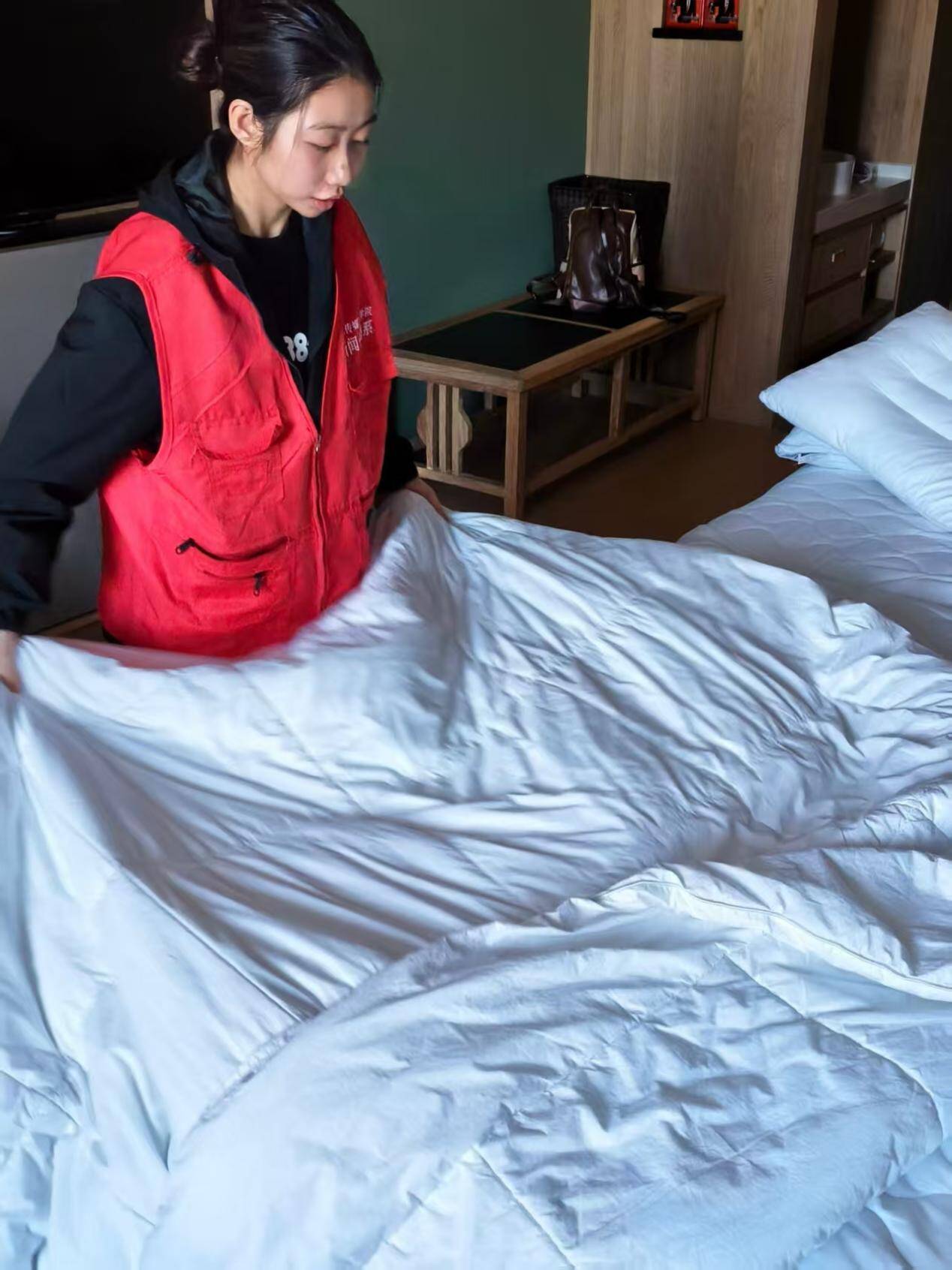 志愿服务期间,学子们分阶段投入不同岗位历练。首日聚焦古城摆摊服务,从新鲜食材备置、摊位创意布置,到艺术品有序陈列、游客贴心导览,全程参与运营。面对假期客流高峰,学生们以饱满热情回应游客需求,用高效协作化解工作难题。次日,同学们到达酒店客房岗位,一丝不苟完成床品更换,卫生间精细化清洁,客房物品规范归置等工作,深刻领悟“细节铸就服务品质”的行业准则。